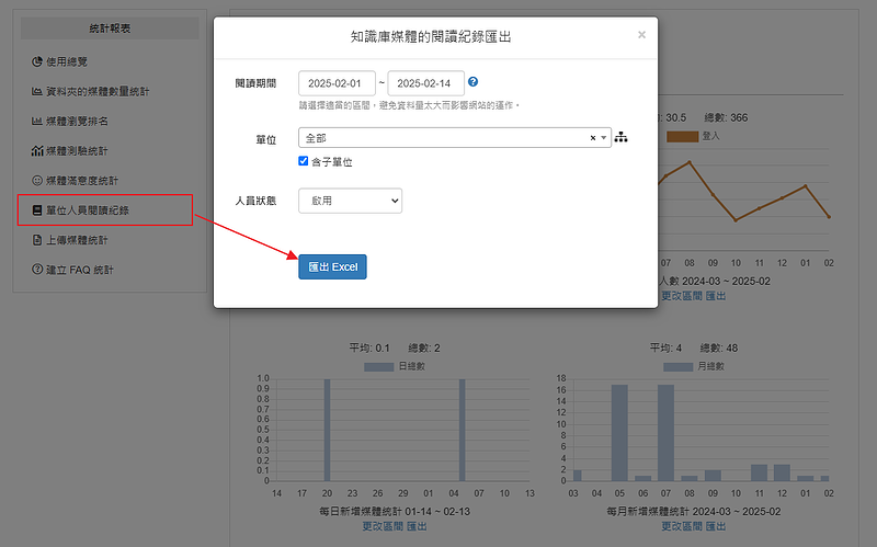 點「單位人員閱讀紀錄」就能匯出 excel 進行查看。