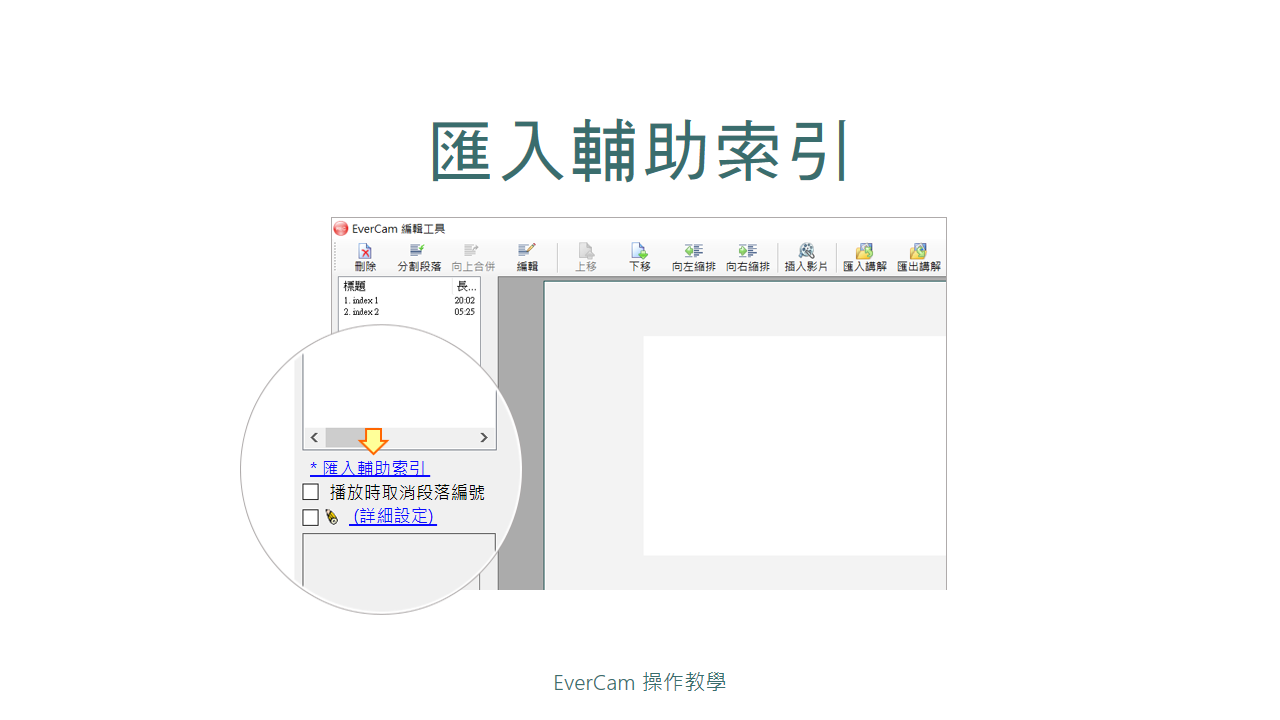 匯入輔助索引很簡單! 首先,進入「EverCam / 編輯講解」,再參考下列步驟,就能匯入輔助索引。