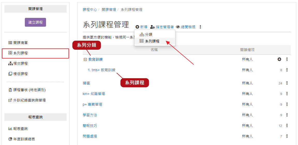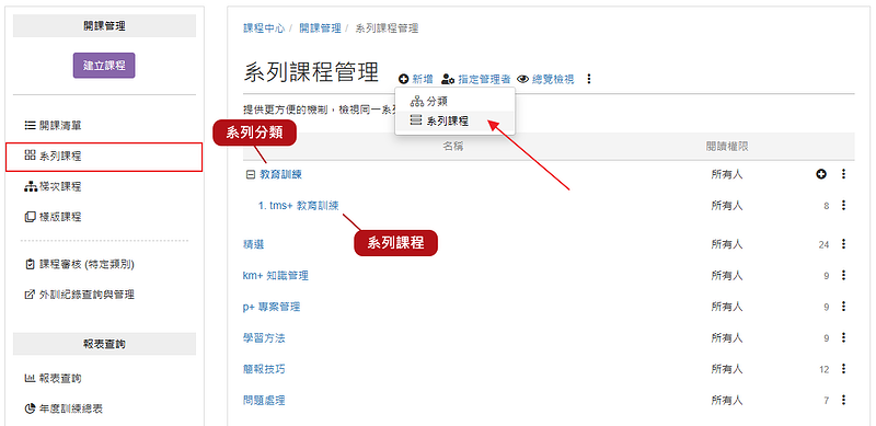 需先將「系列課程」狀態設定成「顯示」,此頁面才會顯示,避免不小心讓一般使用者看到所有的系列課程。