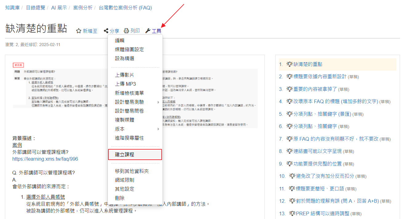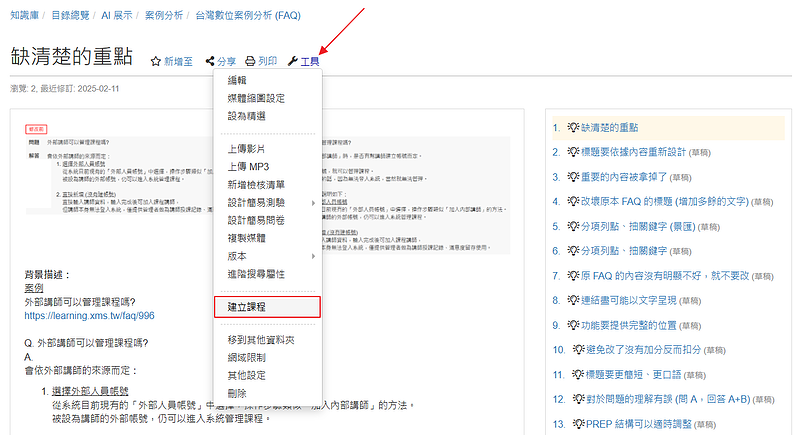透過「工具」下拉選單的「建立課程」,