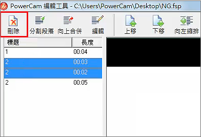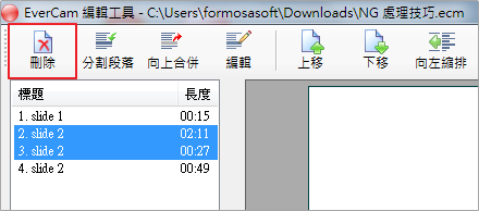 切換到 EverCam 選單,進入「編輯」功能,選擇不要的段落並「刪除」。