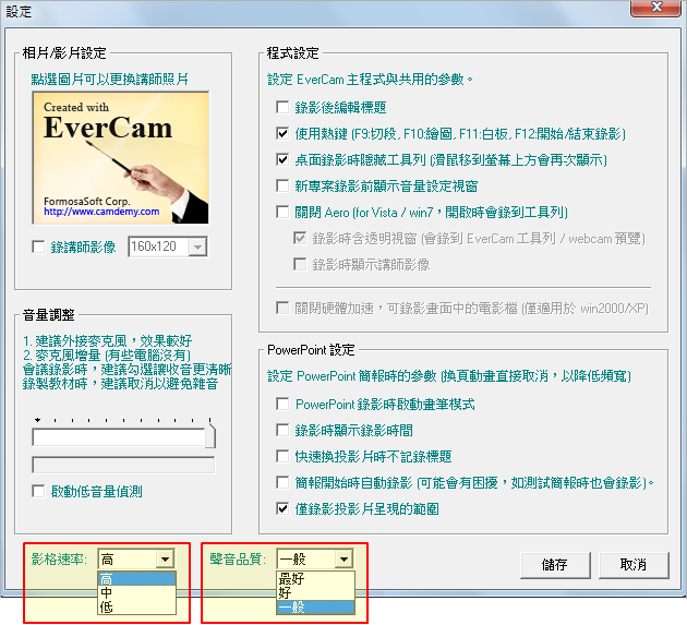 EverCam 除了可以設定「影格速率」,也提供了「聲音品質」的選擇。