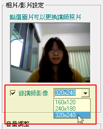 勾選「錄講師影像」( 需先接上 webcam or DV ),並選擇解析度 ( 最大至 320 x 240 px )