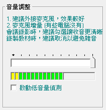對麥克風講話並將音量調整至綠色範圍內;若勾選 「啟動低音量偵測」 時,EverCam 就會在開始錄影時,偵測音量,並在聲音過小時跳出提醒視窗。