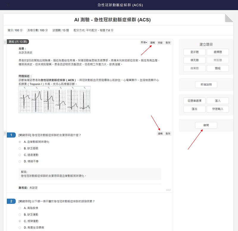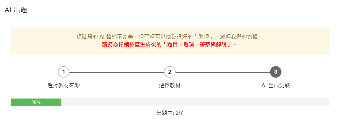 - 測驗:AI 會依據不同類型的內容,設計成題組的形式。