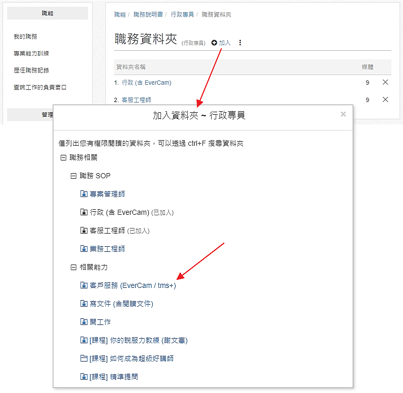 建議將該資料夾的權限開放給該職務的人,讓同仁可以將工作內容中的相關 SOP / FAQ 在其中整理,