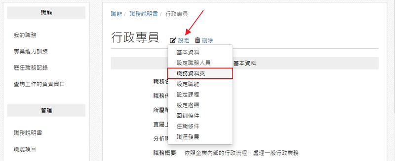 管理者從職能頁面,進入特定職務的「職務說明書」,點擊下拉選單「設定 / 職務資料夾」。