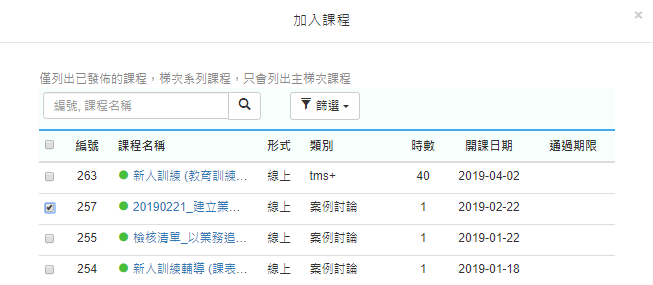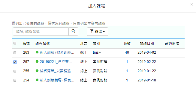 透過搜尋或篩選條件,建議選擇該職務新人「必修」的課程,其他相關課程 (選修),建議放在職能項目對應的課程。