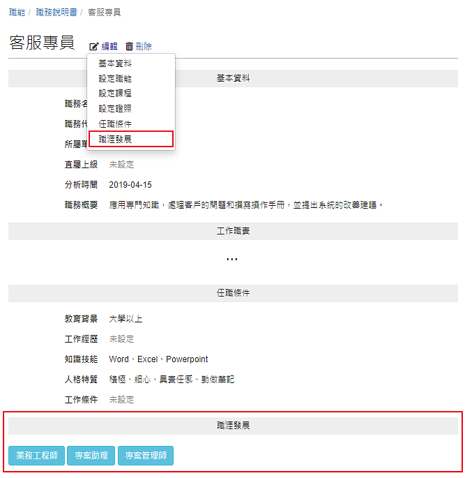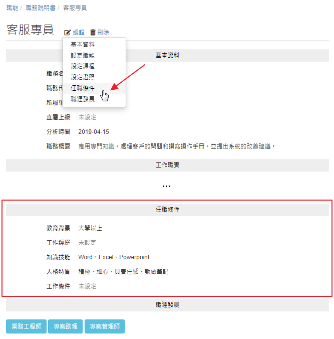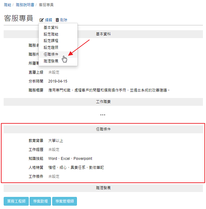 進入職務說明書的頁面,在「編輯」的下拉選單,點擊「任職條件」。
