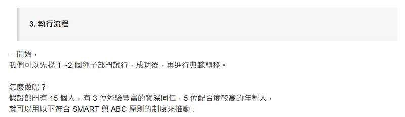 建議可以加上數字 1, 2, 3 的編號,可以讓結構更清晰之外,也方便溝通定位。