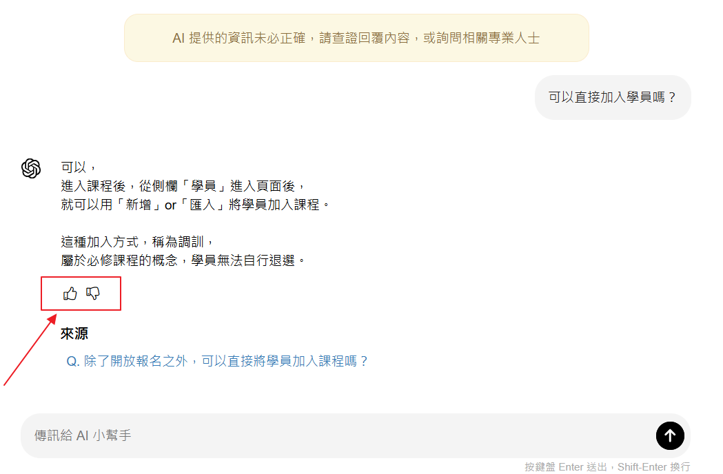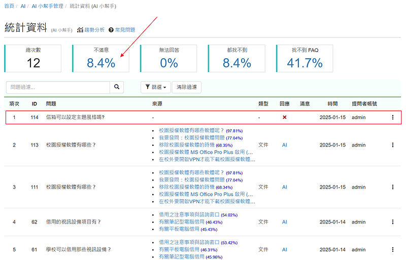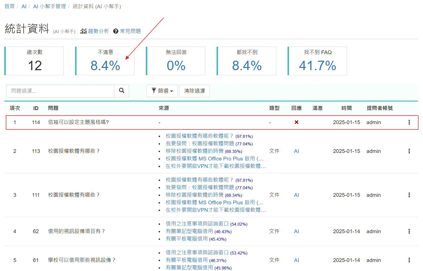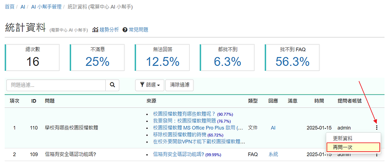 系統會紀錄使用者的提問與 AI 的回應,透過統計資料與趨勢分析,提供 PDCA 持續改善的依據與方向。
