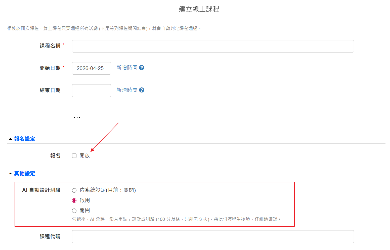 在學校的學習平台,透過「加分」作業的方式 (例如,學期成績 +1 分),引導學生通過課程的測驗以及上傳「完課證書」當作業。
