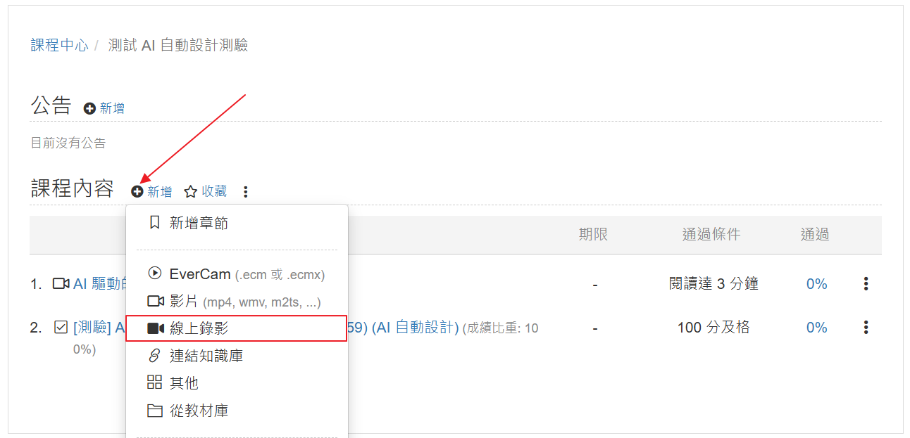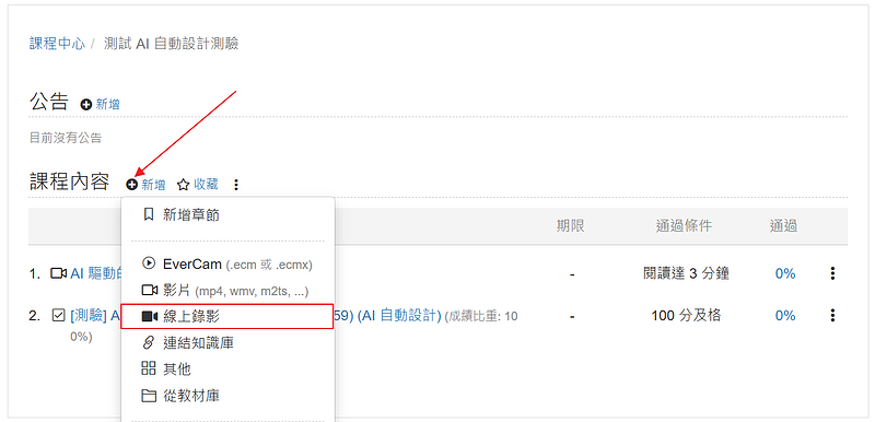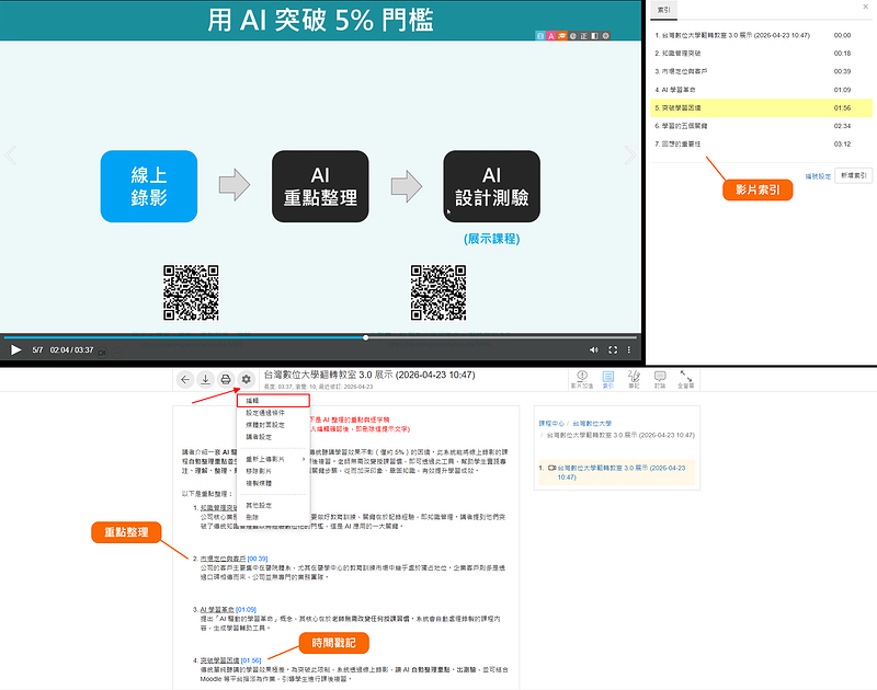 透過上課線上同步錄影、AI 整理重點、測驗的方式,